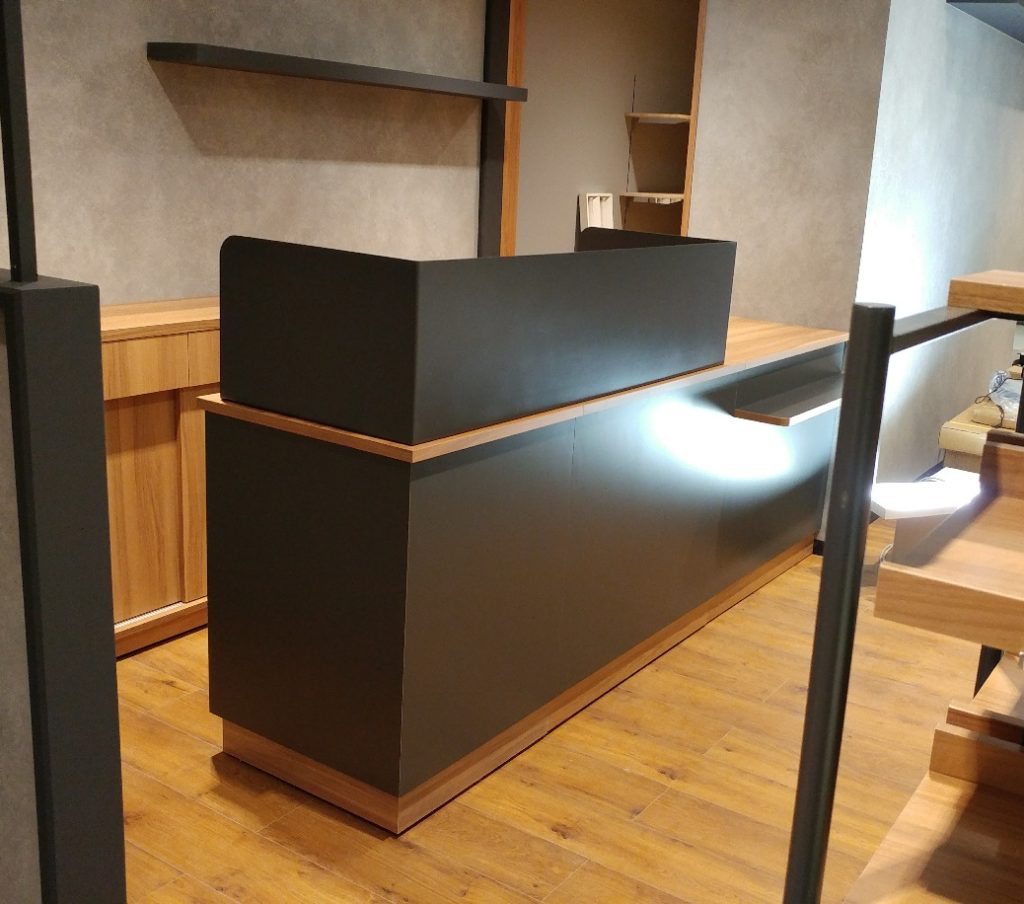 ちなみに、レジ台の目隠し板はスチールを側面のポリ合板の色に合わせて塗装をしています。