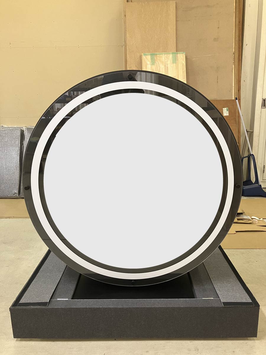 イベント時に使用する丸形のロゴサイン什器とそれを運搬する用の通い箱を製作しました。
