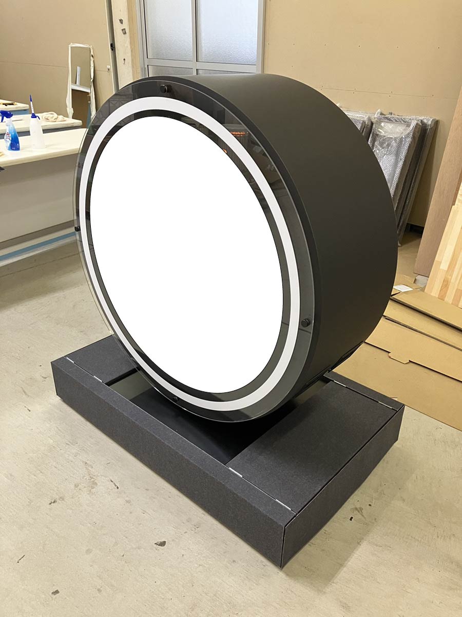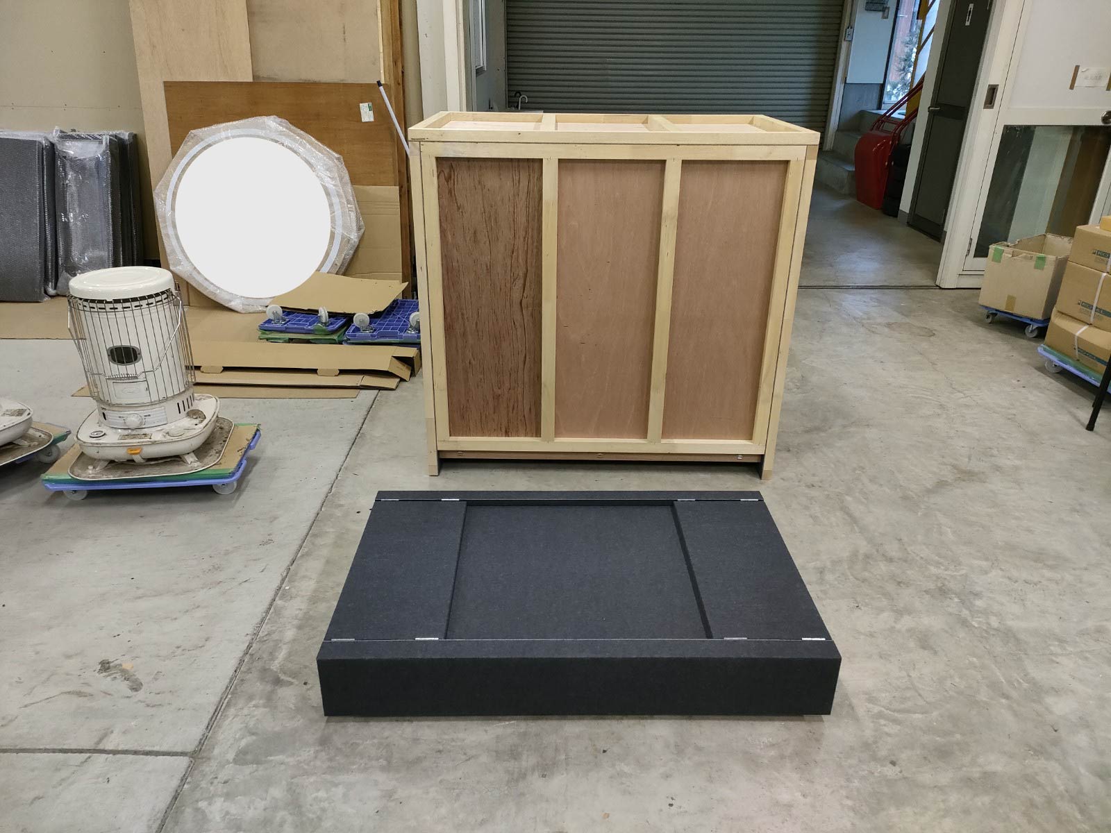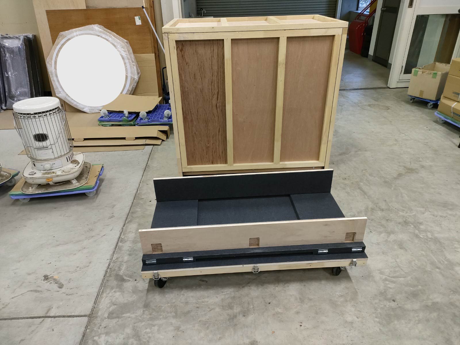 そのままの状態で搬出入を繰り返すとキズがついたり破損してしまう恐れがあるため、移動がしやすいようなキャスター付きの専用の箱も合わせて製作しました。
