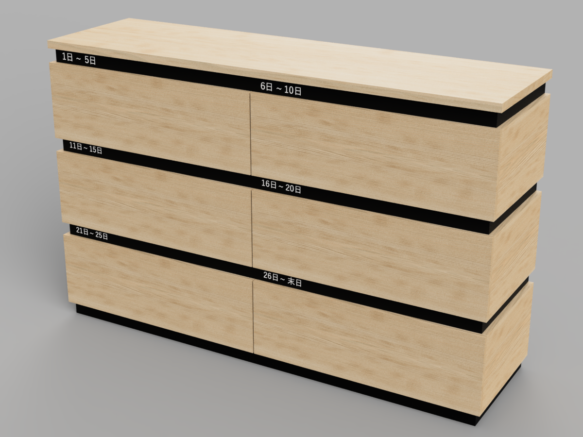 黒いメラミン部分は、引出を引き出す際の手がかり用のスキマを兼ねていて、実用性もあるデザインとなっています。