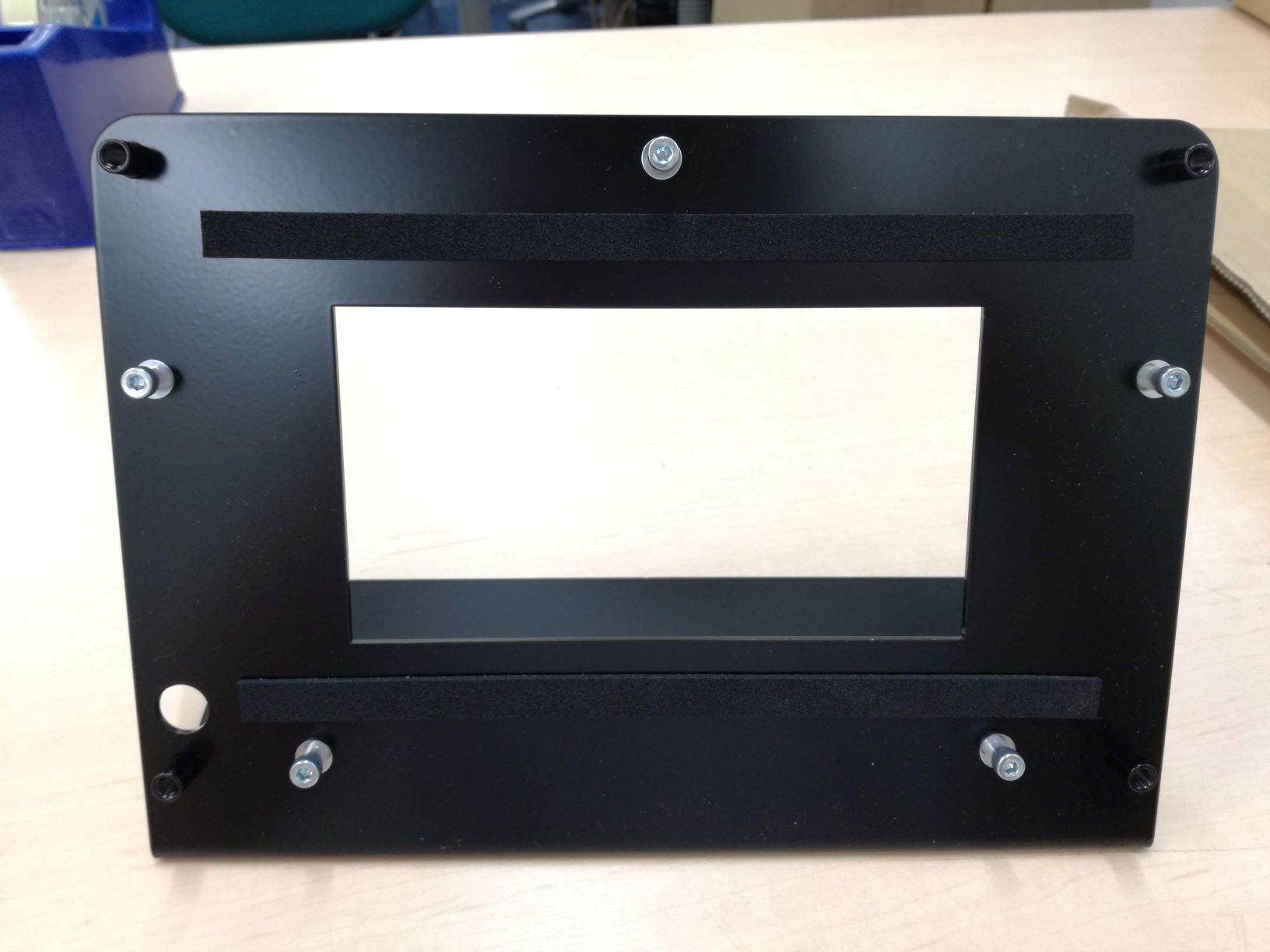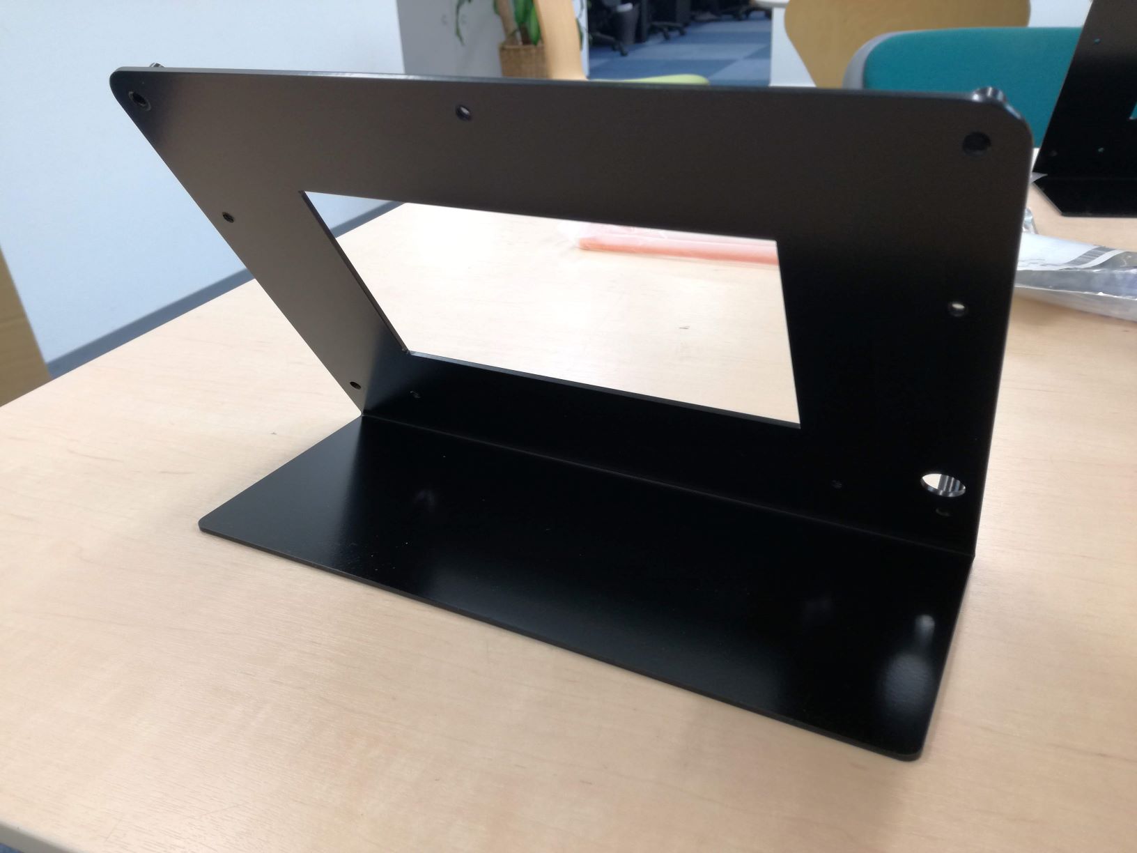 これはプラスチックのカバーとスチール土台で、タブレットを挟み込むために必要になります。タブレットがずり落ちてしまわないように、ガイドになるビスを取り付けられるようにしています。