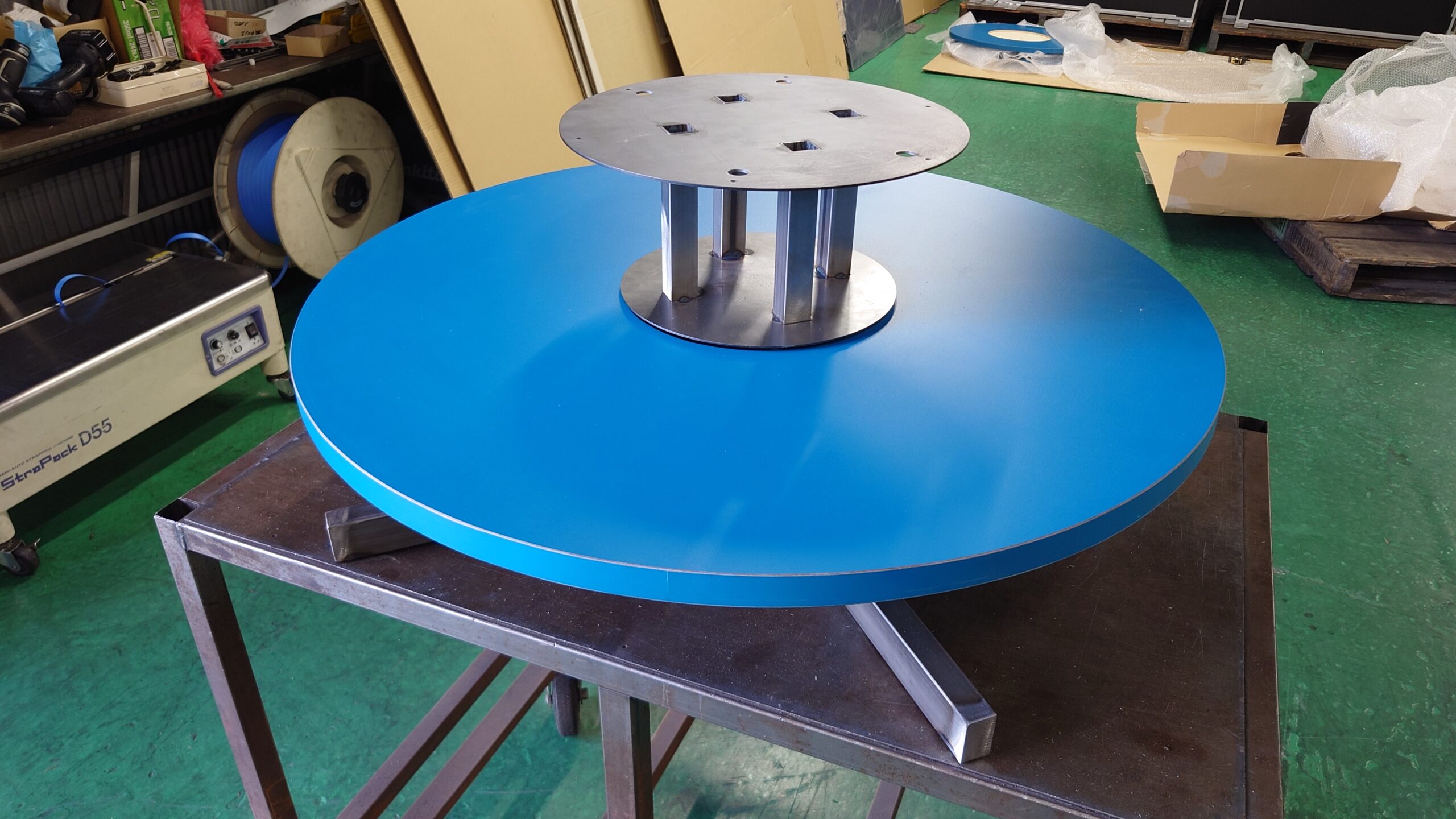 今回の什器の特徴として、直径770mmの欄干(こぼれ止め金物)が一周ぐるりと回っています。